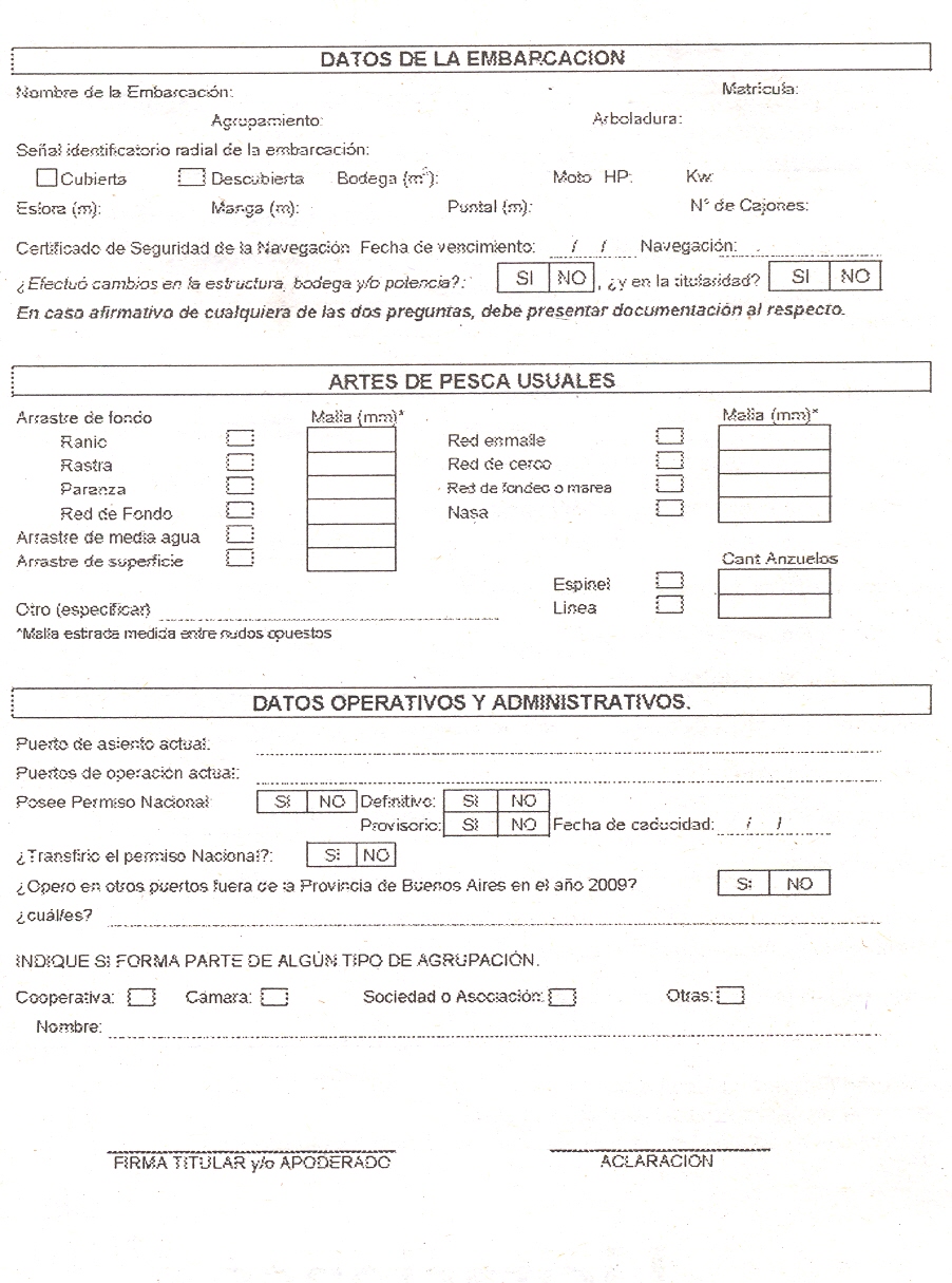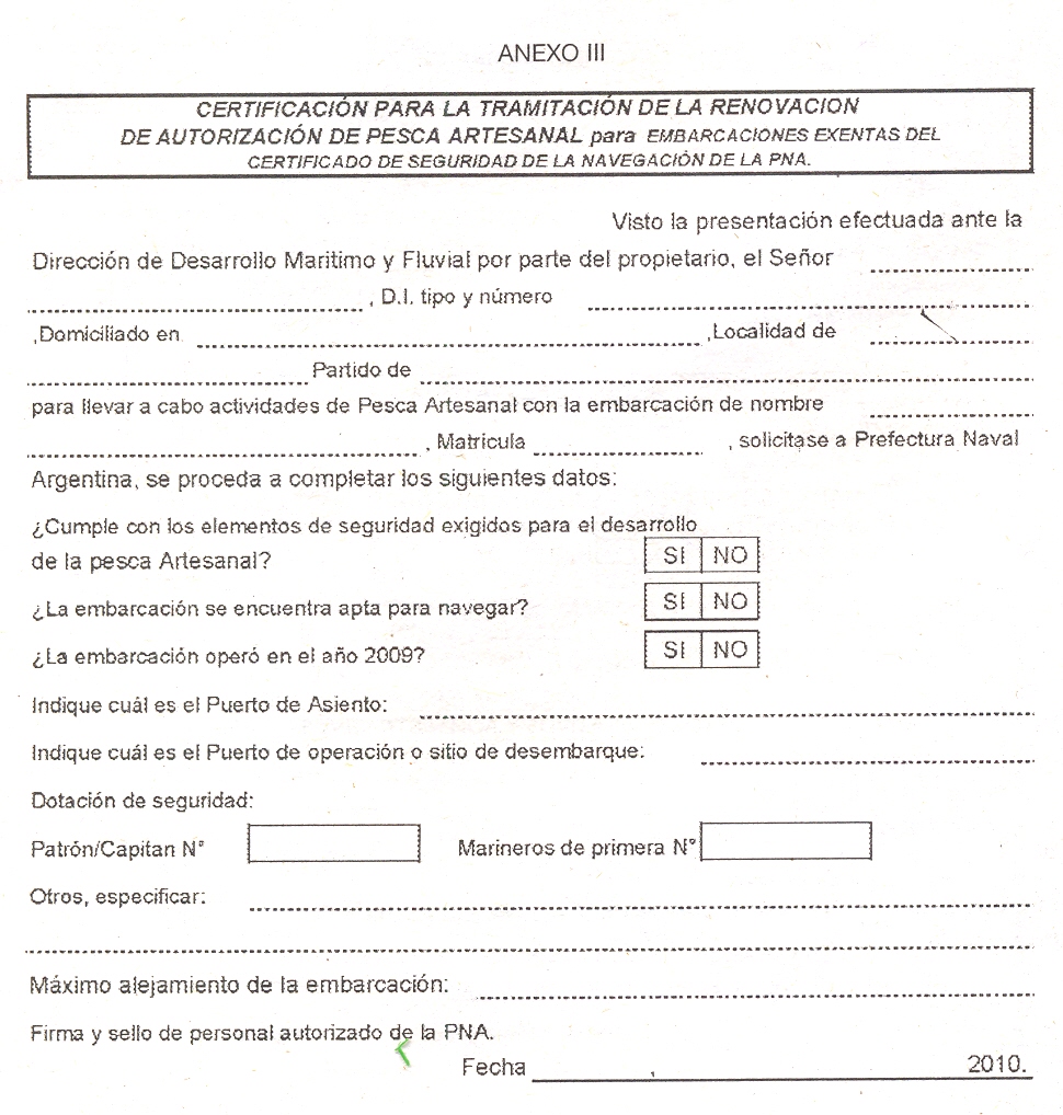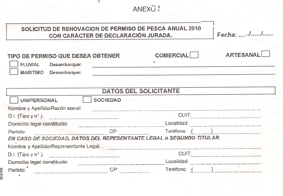 - Solicitud de renovación de permiso de pesca anual 2010 (Anexo I).