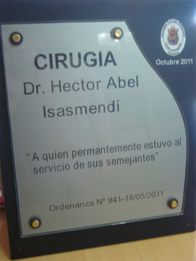 El viernes 11 del corriente, con motivo del 98 Aniversario de la Localidad de Stroeder, el Honorable Concejo Deliberante del Partido de Patagones, sancionó días pasados una Ordenanza donde se instituye el nombre de Dr. Héctor Abel Isasmendi, al área del Hospital Municipal de la localidad de Stroeder donde se presta el servicio de cirugía. El médico también fue homenajeado en el hospital de San Cayetano hace cinco años, cuando se impuso su nombre a la sala de guardia del nosocomio local.